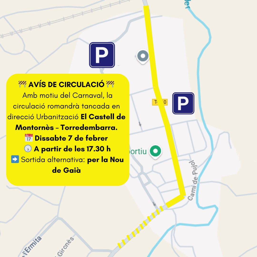Amb motiu de la rua de Carnaval, aquest proper dissabte 7 de febrer, la circulació romandrà tancada en direcció Urbanització El Castell de Montornès – Torredembarra.